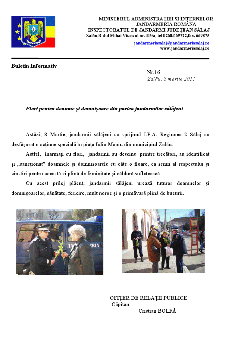 Cu ocazia zilei Mărţişorului şi a zilei de 8 Martie, poliţişti ai Serviciului Rutier, din cadrul Inspectoratului de Poliţie Judeţean Sălaj, în colaborare cu Banca Comercială Română, au oferit, azi, participantelor la trafic, câte un mărţişor şi o floare. Astfel au fost înmânate 1.000 de mărţişoare şi tot atâtea flori.
