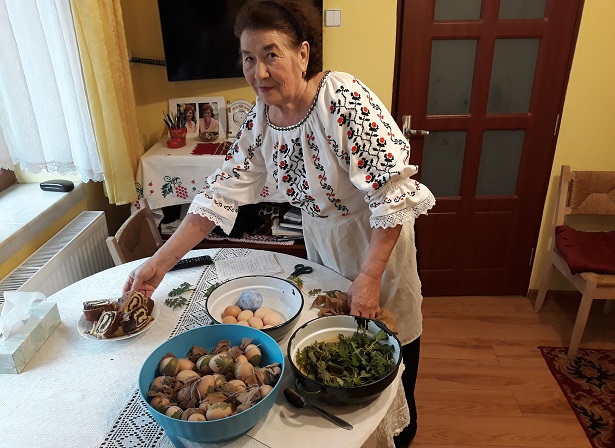 Ileana Graţiana Pop pentru masa de sărbători. Cele mai importante sunt ouăle vopsite în apă cu coji de ceapă. Rezultatul este deosebit, o culoare superbă, un roşu potrivit de aprins. Numai că nu este o simplă culoare, ci una din care nu lipseşte modelul unei frunzuliţe aplicate pe ou cu ajutorul unui ciorap. După ce au fiert în oala plină de apă cu coji de ceapă, ouăle sunt luate pentru a fi şterse şi unse cu puţină slănină. Aşa prin un luciu persistent, pentru o prezentare aşa cum se cuvine, mai ales că multe vor ajunge la biserică, în buzunarele celor mici. Nu vor rezista prea mult, pentru că imediat după slujba de Înviere, ouăle vor fi ciocnite alături de vorbele frumoase şi nelipsite de la această sărbătoare: Hristos a Înviat!