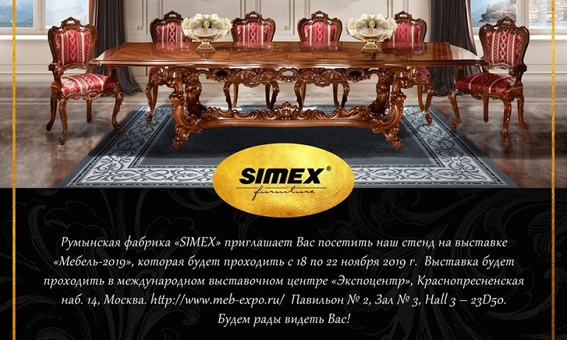 Alături de SIMEX, 14 mari producători români reprezintă ROMÂNIA la expoziția de mobilă și design MEBEL, care se desfășoară la Moscova, în perioada 18 – 22 noiembrie 2019. Expunem pe o suprafață de 522 mp. Din datele statistice pe primele 7 luni ale acestui an rezultă o creștere cu 42% a exportului de mobilă românească pe Federația Rusă.