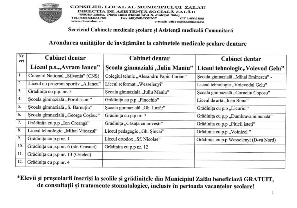 Detalii cu privire la unitățile de învățământ arondate fiecărui cabinet dentar le găsiți în fotografiile atașate.