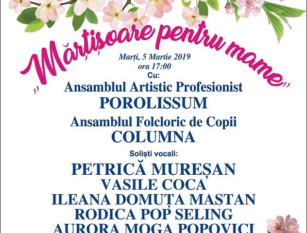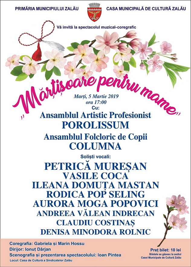 muzical-coregrafic „Mărţişoare pentru mame”, marți, 5 martie 2018, ora 17:00, la Casa de Cultură a Sindicatelor Zalău cu Ansamblul Artistic Profesionist ”Porolissum” şi Ansamblul Folcloric ”Columna”.