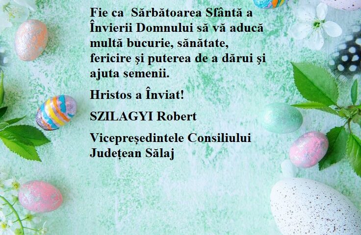 Fie ca Sărbătoarea Sfântă a Învierii Domnului să vă aducă multă bucurie, sănătate, fericire şi puterea de a dărui şi ajuta semenii. Hristos a Înviat! SZILAGYI Robert Vicepreședintele Consiliului Județean Sălaj