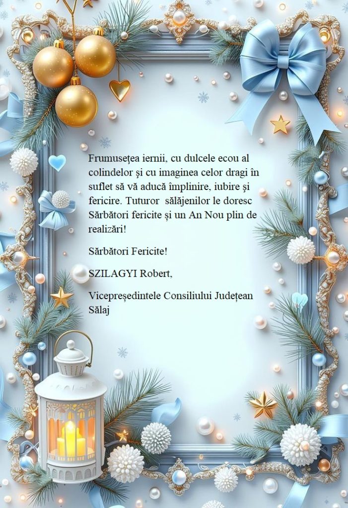 Frumuseţea iernii, cu dulcele ecou al colindelor şi cu imaginea celor dragi în suflet să vă aducă împlinire, iubire şi fericire. Tuturor sălăjenilor le doresc Sărbători fericite și un An Nou plin de realizări!