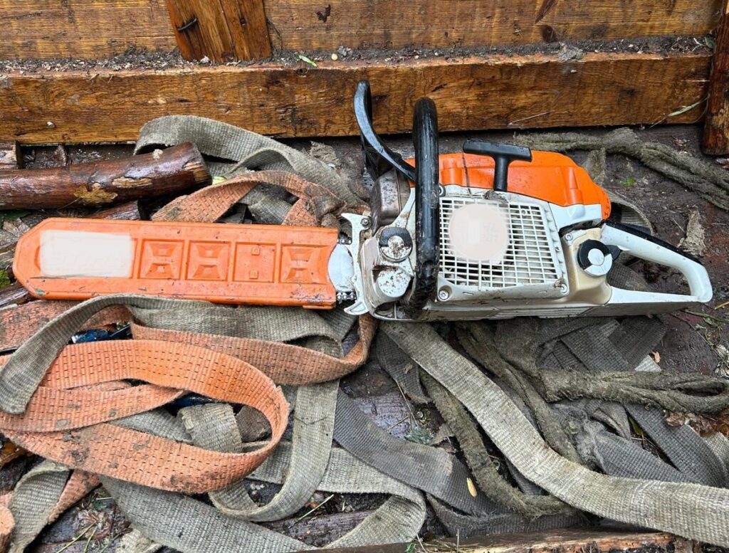 Masa lemnoasă și un motofierăstrău au fost ridicate în vederea confiscării.
