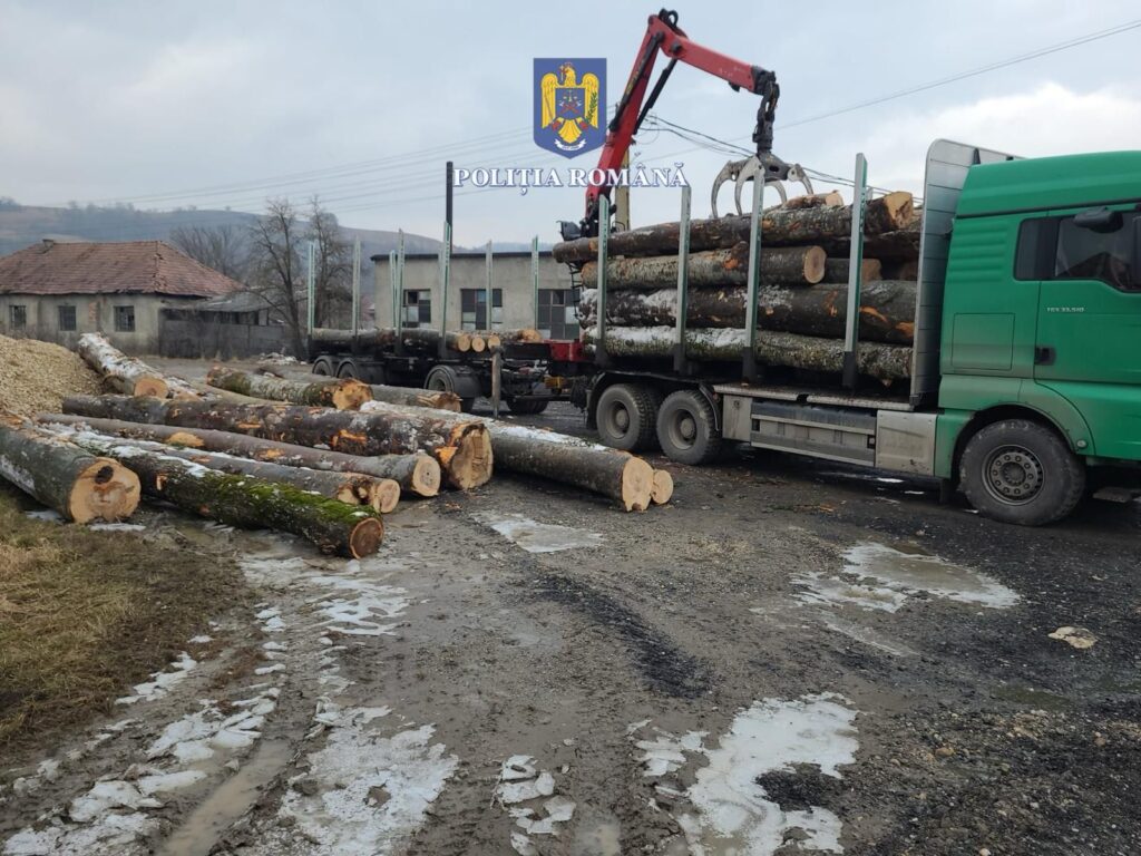 De asemenea, la data de 2 februarie a.c., polițiștii Biroului pentru Protecția Fondului Forestier și Piscicol au depistat în trafic un bărbat care transporta cu un ansamblu de vehicule format din cap tractor și semi-remorcă, 39,692 metri cubi de lemn rotund din speciile fag și ulm de munte, iar în avizele de însoțire a materialului lemnos erau înregistrați doar 31,8 metri cubi de material lemnos.