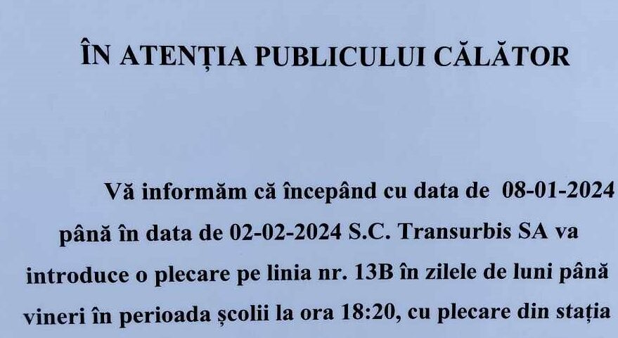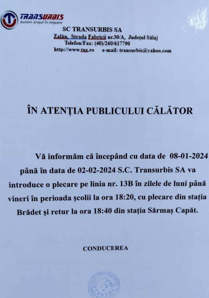 Transurbis introduce o plecare pe linia Brădet – Sărmaș, în perioada 08.01.2024 – 02.02.2024