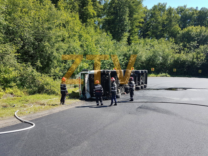 la urcare in ultima curba, acolo unde s-au mai intamplat evenimente rutiere. Din declaratiile purtatorului de cuvant de la ISU Salaj, cpt. Lucian Jacodi am aflat ca la impactul cu solul a iesit fum din autotren, insa pompierii au reusit sa controleze situatia si nu a luat foc. In momentul de fata se asteapta o macara care sa repuna pe roti tirul. Circulatia este blocata pe ambele sensuri, iar pompierii asigura zona pentru a evita un incendiu.