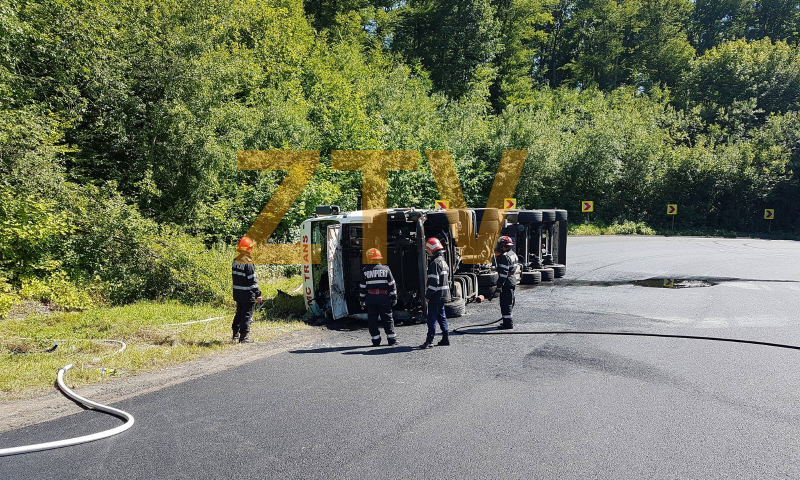 la urcare in ultima curba, acolo unde s-au mai intamplat evenimente rutiere. Din declaratiile purtatorului de cuvant de la ISU Salaj, cpt. Lucian Jacodi am aflat ca la impactul cu solul a iesit fum din autotren, insa pompierii au reusit sa controleze situatia si nu a luat foc. In momentul de fata se asteapta o macara care sa repuna pe roti tirul. Circulatia este blocata pe ambele sensuri, iar pompierii asigura zona pentru a evita un incendiu.