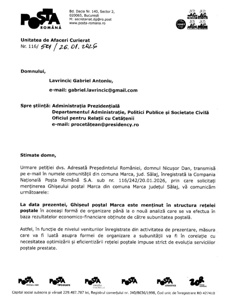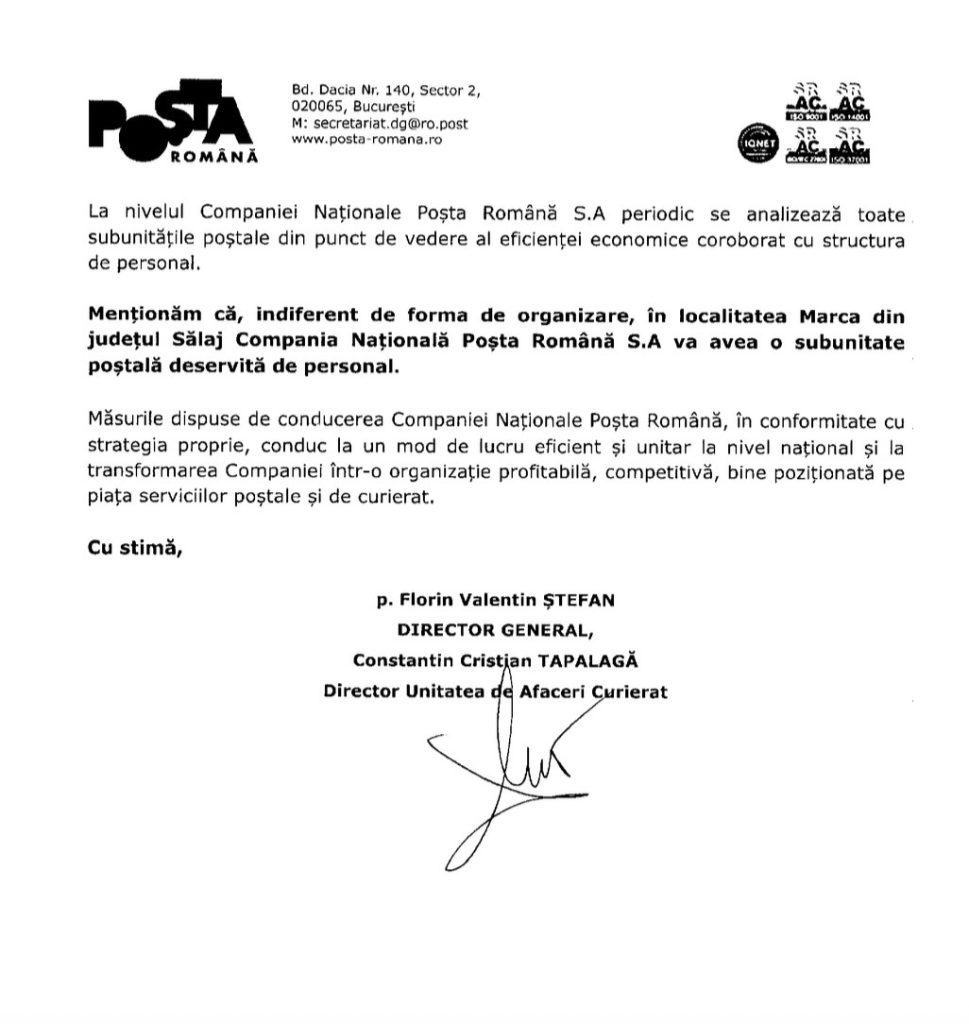 nu închidă Ghișeul Poștal din comuna MARCA, jud. Sălaj, deoarece această comună în frunte cu Ghișeul Poștal