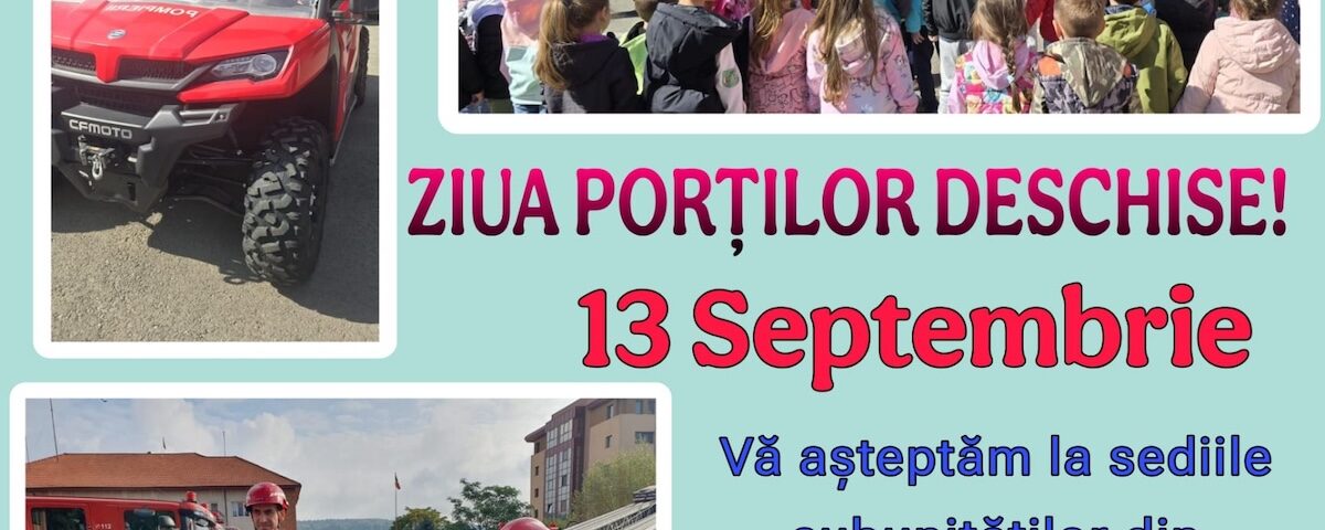 Sâmbătă, 13 septembrie, cu prilejul Zilei Pompierilor din România, vă invităm între orele 09:00 – 16:00, la Ziua Porților Deschise.