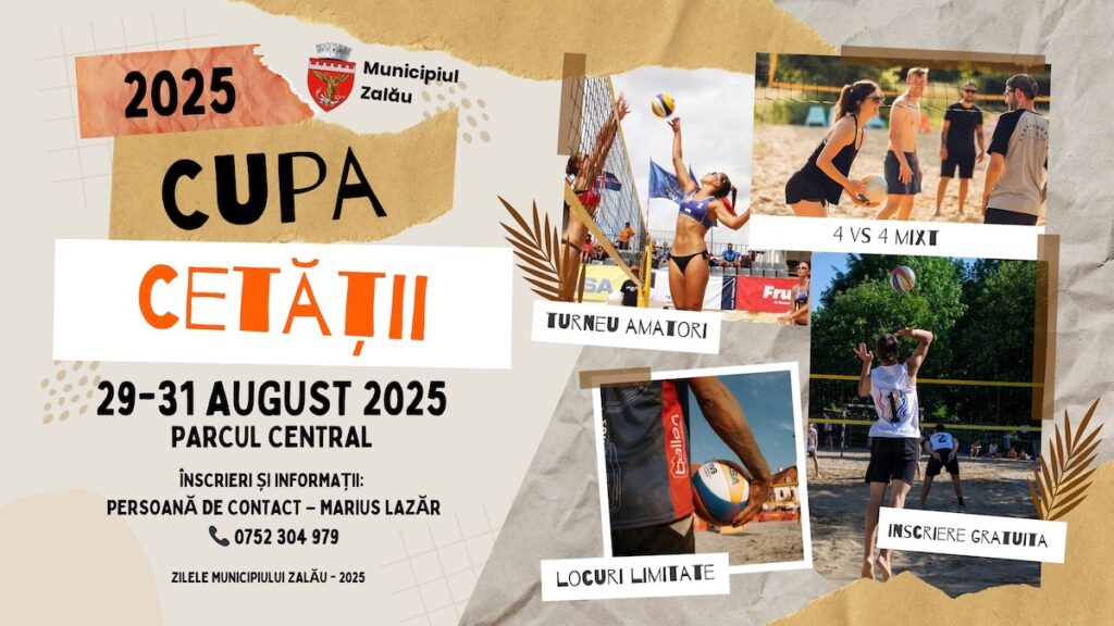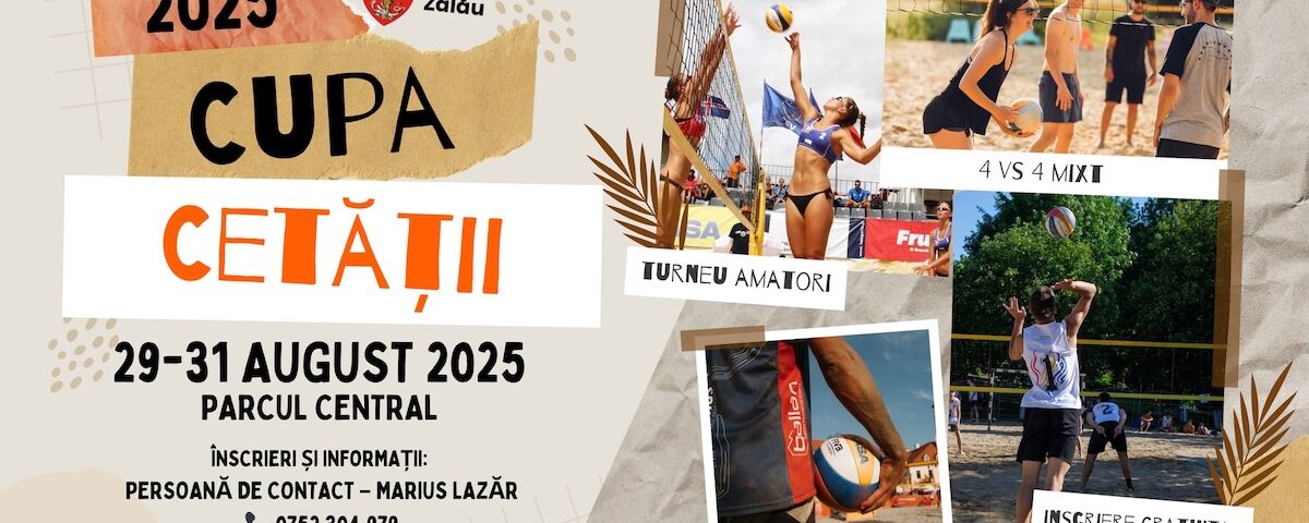 Primăria Municipiului Zalău organizează, în perioada 29 – 31 august 2025, competiția sportivă „Cupa Cetății”, la terenul de beachvolley din Parcul Central, în cadrul Zilelor Municipiului Zalău.