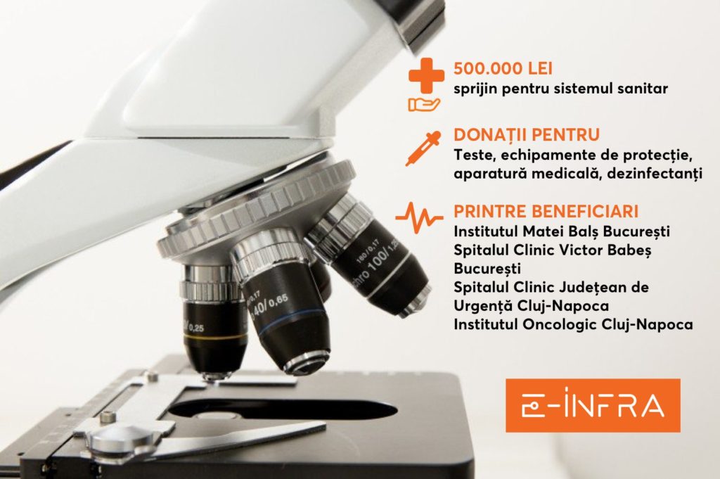 București, 22 martie 2020 – Grupul de companii E-INFRA anunță astăzi că donează 500.000 lei, prin intermediul Netcity Telecom în București și Nova Power & Gas în Cluj-Napoca, pentru susținerea sistemului sanitar românesc și a eforturilor de a controla efectele locale ale situației pandemice curente.