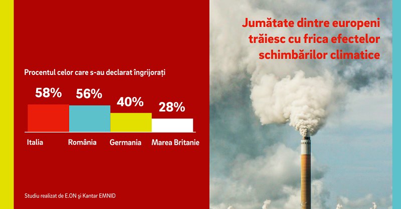 În topul celor mai îngrijoraţi europeni sunt românii, 56% dintre cei chestionați declarându-se neajutoraţi în ceea ce privește schimbările climei. Ne situăm astfel pe locul al doilea, după italieni, care împărtășesc această îngrijorare în proporție de 58%.