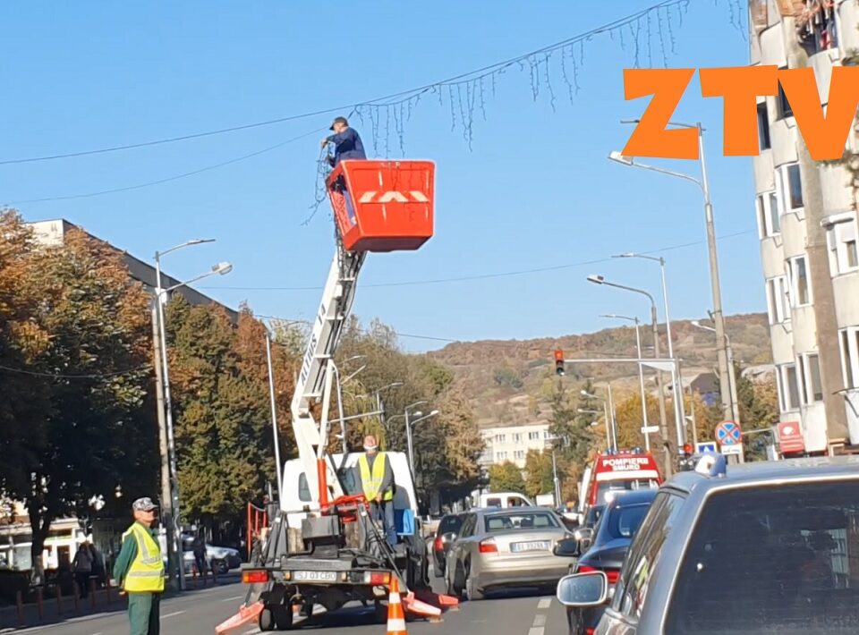 Circulatie ingreunata de muncitorii care au montat ghirlandele