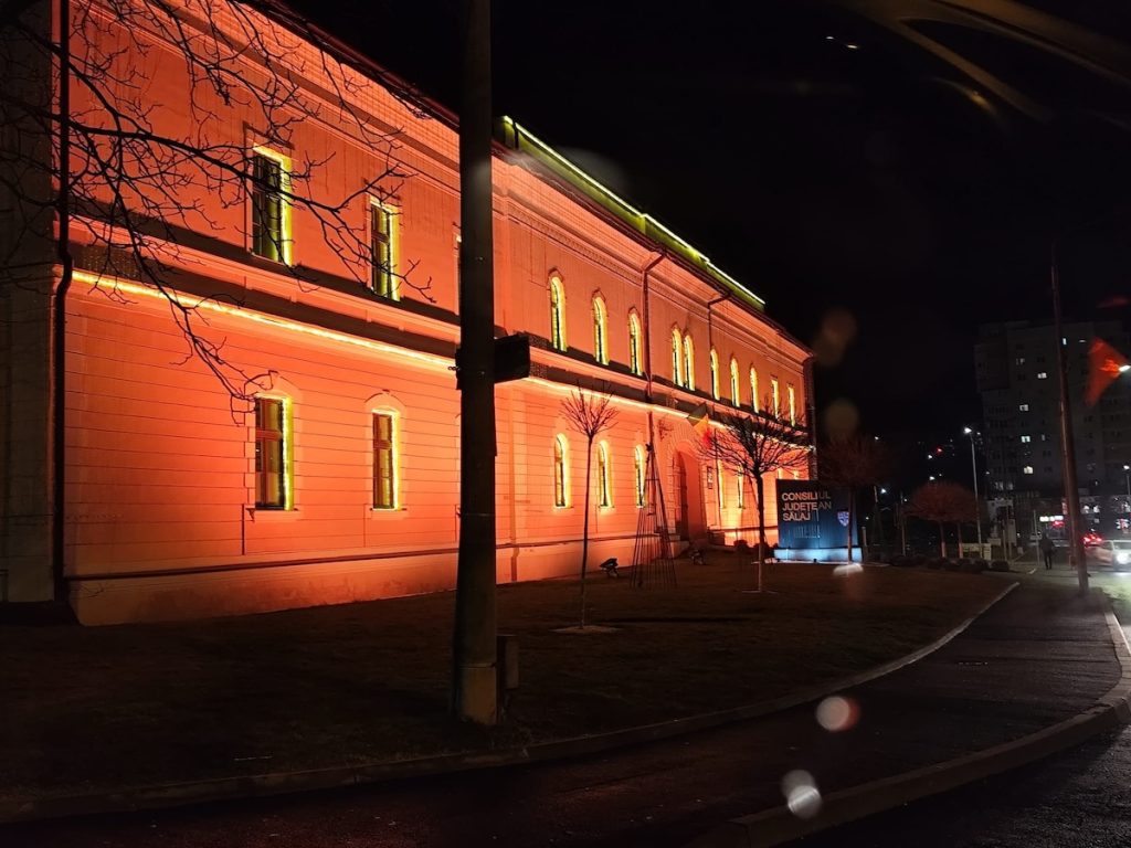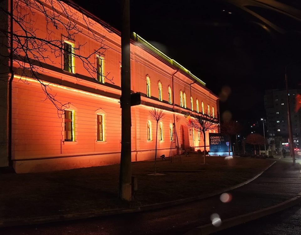 Consiliului Județean Sălaj iluminată în portocaliu, simbolizând solidaritatea pentru pacienții oncologici și familiile acestora